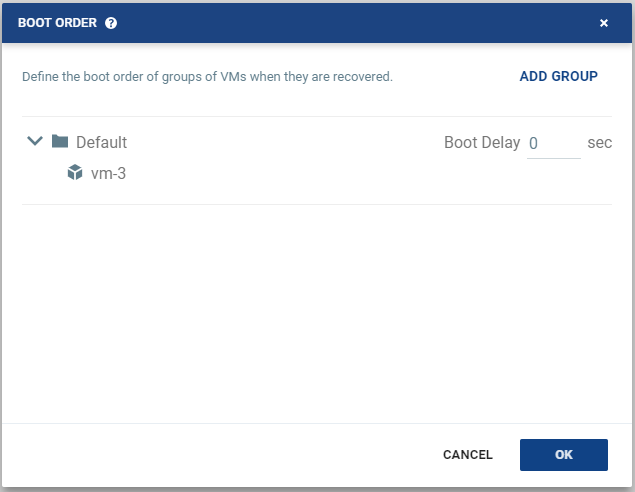 Initially, virtual machines in the VPG are displayed together under the default group. If you want specific machines to start before other virtual machines, define new groups with one or more virtual machines in each group.