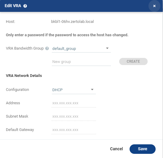 The Zerto Virtual Manager User Interface : Edit VRA Dialog