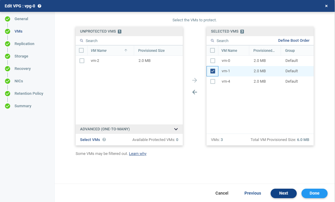 2. In the VMs step, select the virtual machines to remove and click the arrow pointing left to remove these machines from the VPG. The selected virtual machines will no longer be protected.