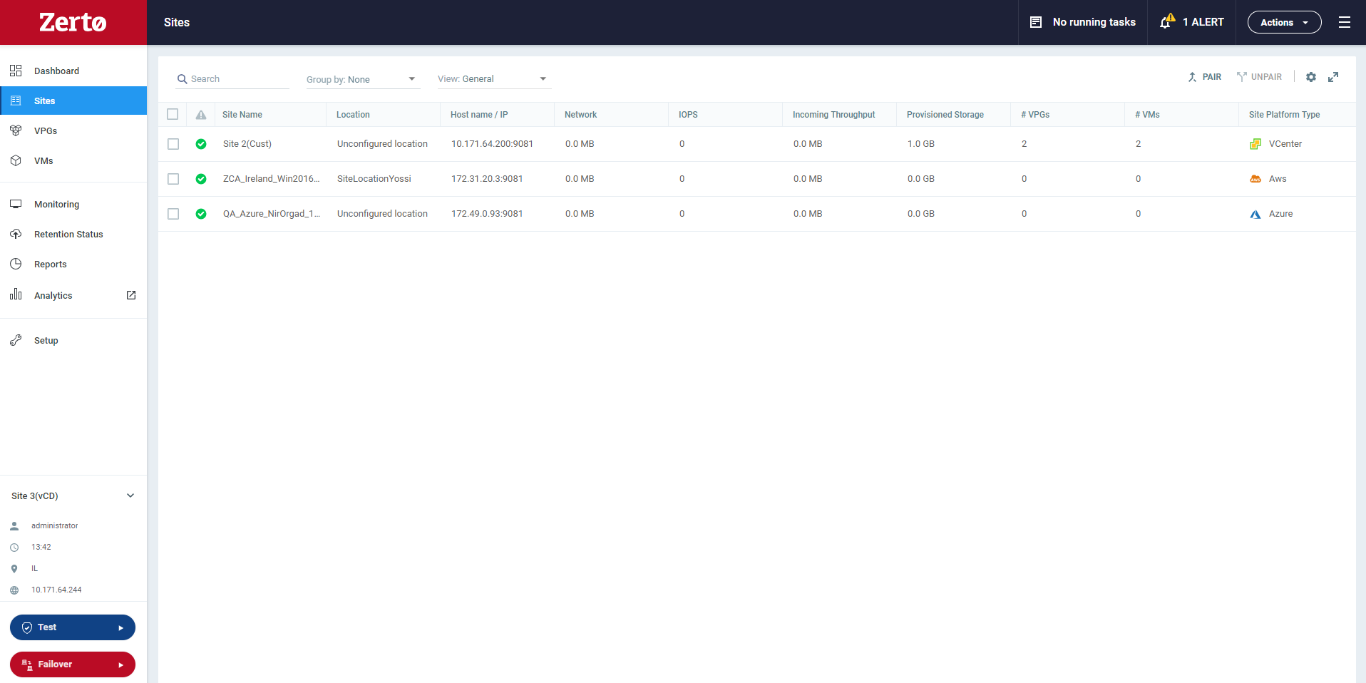 Red: The Zerto Virtual Manager for the site is not running correctly, for example, because communication with the site is down.