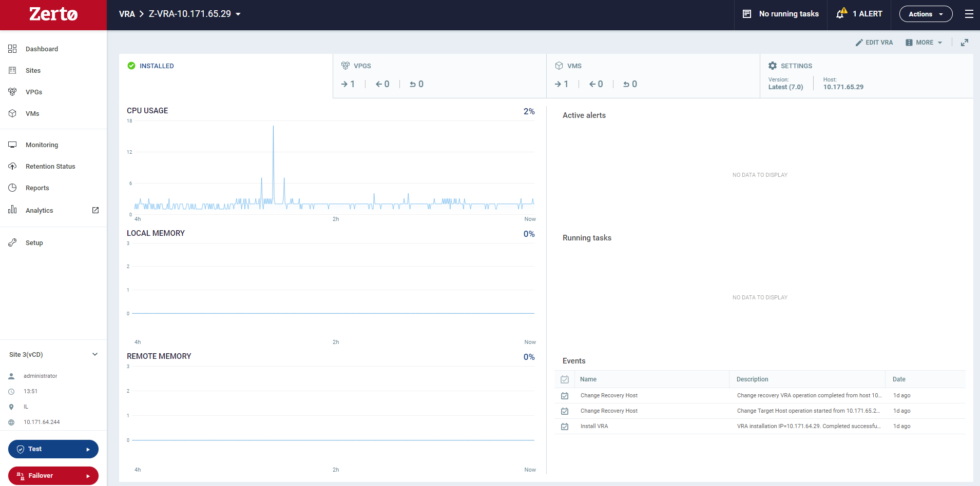 Alert Status: The status of alerts in the VRA virtual machine.