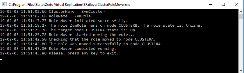 The Zerto Failover Cluster Role Mover tool facilitates an unobtrusive move of the clustered role from one node to the other, with minimal consequences to Zerto Virtual Manager.