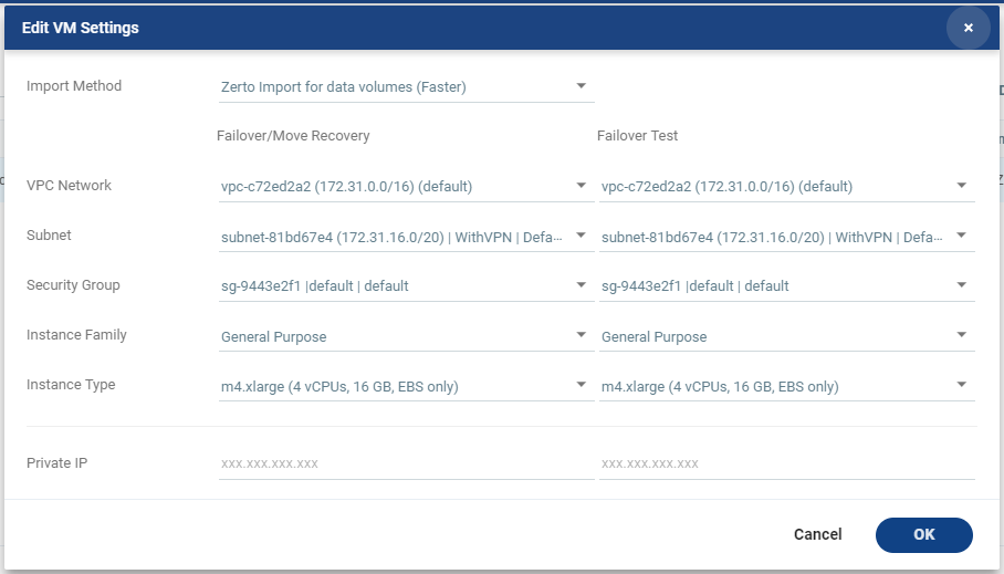 Clearing the values in the Private IP field results in an IP being automatically assigned from the subnet range during a recovery operation.