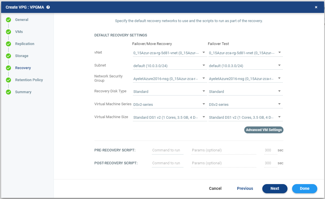 ■ Recovery Disk Type: Select the Azure recovery storage type to which the entire VPG will be recovered to; Premium Managed or Standard Storage. The Virtual Machine Series and Virtual Machine Size fields are updated with the relevant options based on the selected Recovery Disk Type.