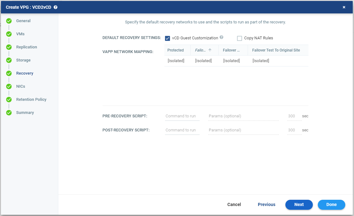 If the recovery volumes are thin-provisioned or not. | If the source disk is thin provisioned, the default for the recovery volume is also thin provisioned. vCD only: Unless the Org vDC only supports thin-provisioned volumes |