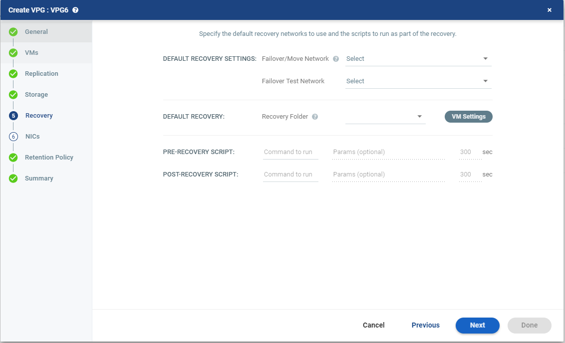 Select the default recovery settings. These are applied to every virtual machine in the VPG.Text Box | Description |