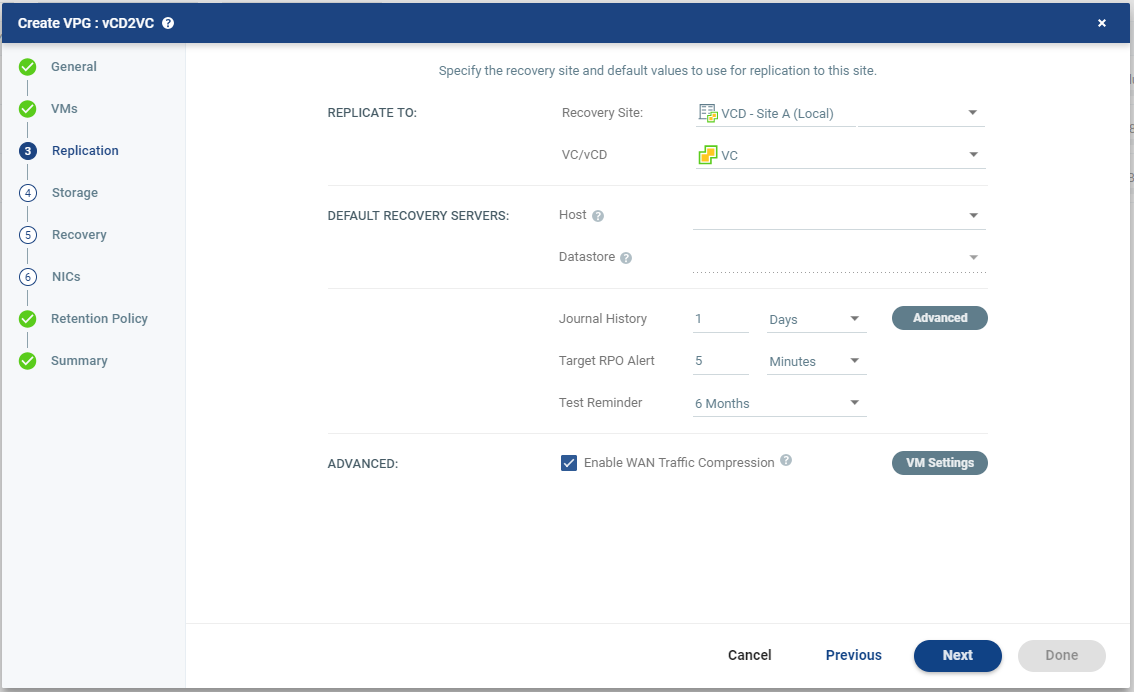 The storage/datastore used for the journal data for each virtual machine in the VPG. Note: This field is not relevant when replicating to a vCD recovery site. | ■ Select the storage/datastore accessible to the host. When you select a specific journal storage/datastore, the journals for each virtual machine in the VPG are stored in this storage/datastore, regardless of where the recovery storage/datastore is for each virtual machine. All protected virtual machines are recovered to the hosts that can access the specified journal storage/datastore. |
