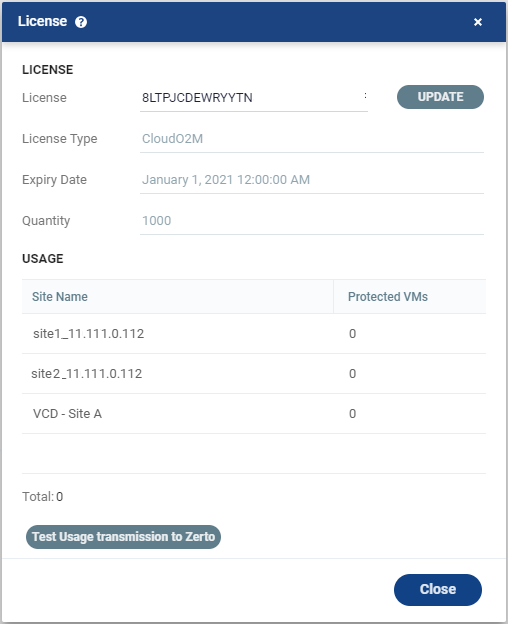 ■ Usage: The sites using the license and the number of protected virtual machines in each site.