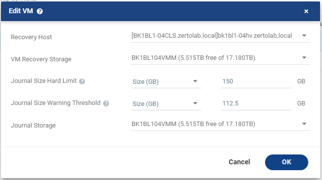 | The size of the journal that triggers a warning that the journal is nearing its hard limit. | Unlimited: The size of the journal is unlimited and it can grow to the size of the recovery storage/datastore. If Unlimited is selected, Size and Percentage options are not displayed. |