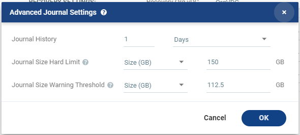 | *The values of Size and Percentage must be less than the configured Journal Size Hard Limit so that the warning will be generated when needed. In addition to the warning threshold, Zerto will issue a message when the free space available for the journal is almost full. |