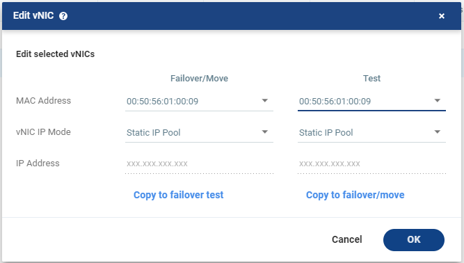 | • | Copy to failover/move: Select this to copy the settings in the Test column to the Failover/Move column. |