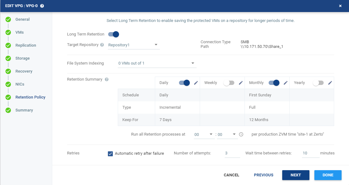 | 41. | Run all retention processes at: The time to start the Retention process. The time is shown in UTC and is according to the Zerto Virtual Manager clock in the production site. All Daily, Weekly, Monthly or Yearly retentions will run at this time. |