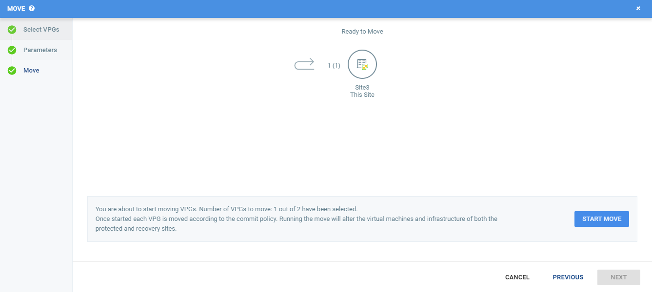 To force a shutdown of the virtual machines, click the Force Shutdown checkbox. If the virtual machines cannot be gracefully shut down, for example if VMware Tools is not installed on one of the virtual machines in the VPG, the Move operation fails unless you specify that you want to force the shutdown. If a utility is installed on the protected virtual machines, the procedure waits five minutes for the virtual machines to be gracefully shut down before forcibly powering them off. |