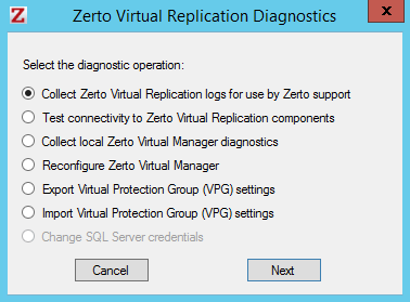 | 1. | Open the Zerto Diagnostics application. For example, via Start > Programs > Zerto > Zerto Diagnostics. |