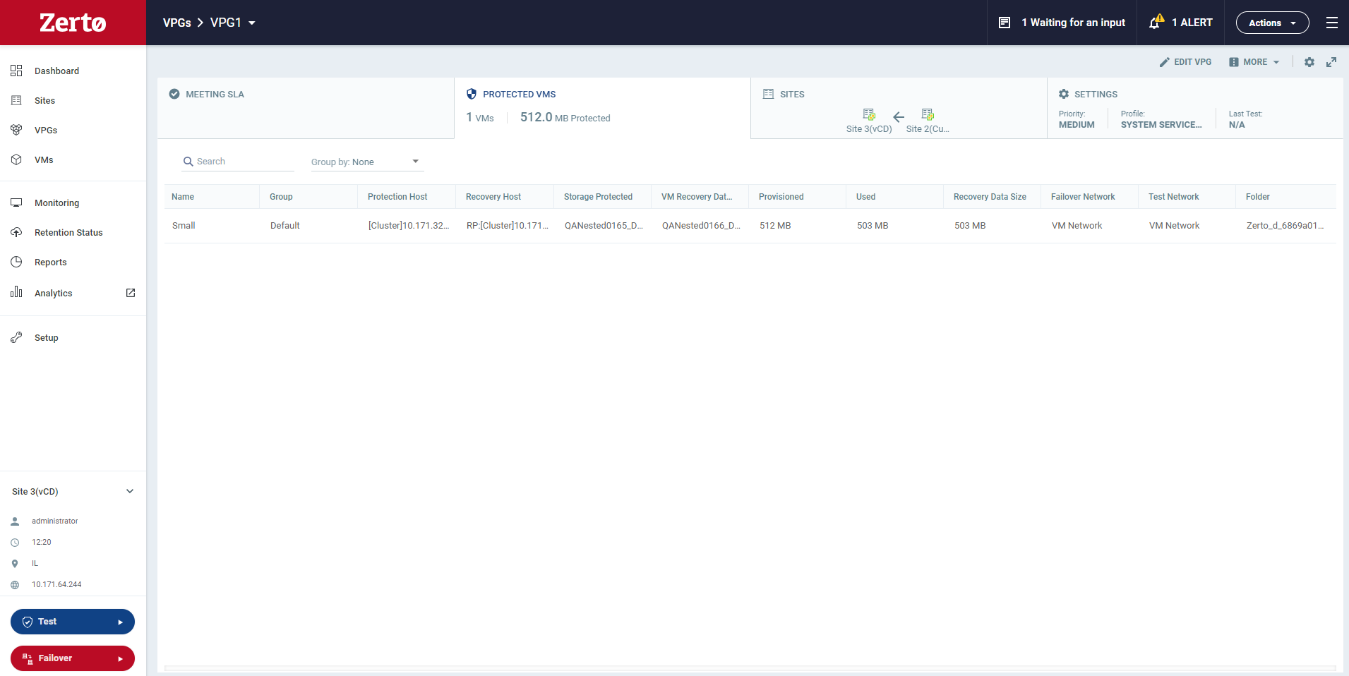RPO: The current Recovery Point Objective (RPO) of the Virtual Protection Group (VPG).