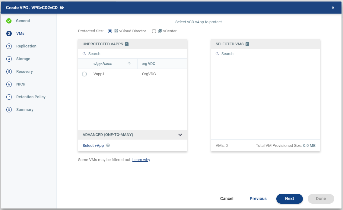 | 5. | To view protected vApps, in the Advanced (One-to-Many) section, click Select vApp. |