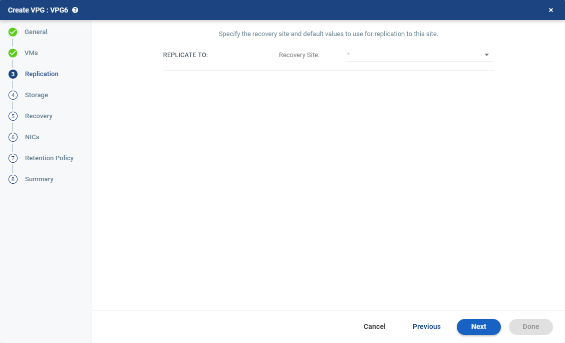 | Note: | You cannot select a recovery site if any of the virtual machines you selected are already in VPGs that recover to that site. |