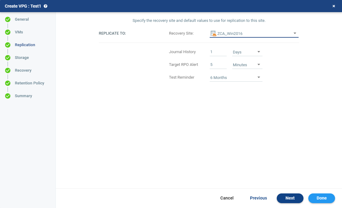 | Note: | You cannot select a recovery site if any of the virtual machines you selected are already in VPGs that recover to that site. |