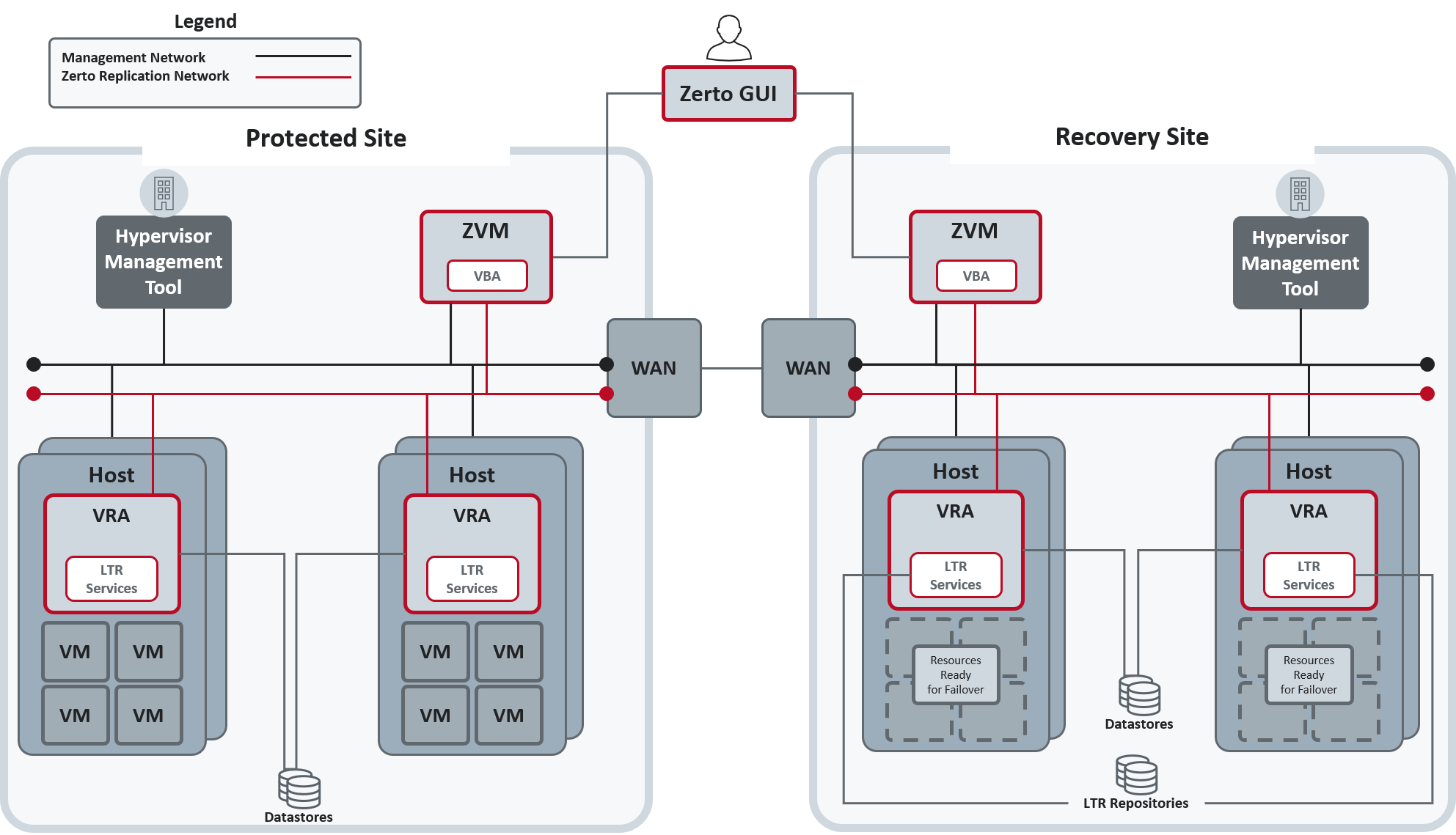 For the architecture diagrams when one of the sites is a cloud service provider, see the Zerto Cloud Manager Administration Guide.