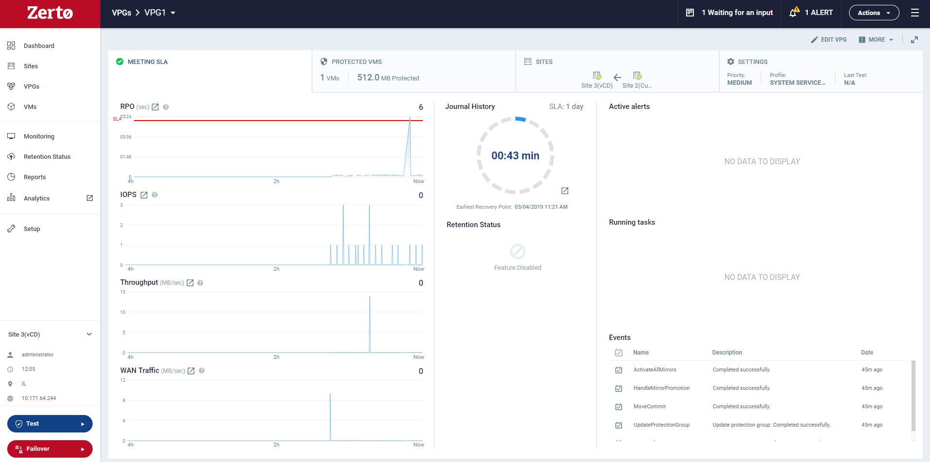 The VRA in the remote site is updated with information about the VPG and then the data on the protected virtual machines are synchronized with the replication virtual machines managed by the VRA on the recovery site. This process can take some time, depending on the size of the VMs and the bandwidth between the sites.