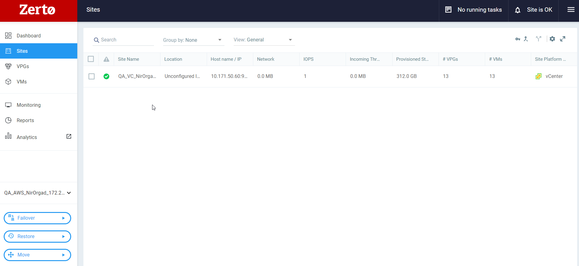 Red: The Zerto Virtual Manager for the site is not running correctly, for example, because communication with the site is down.