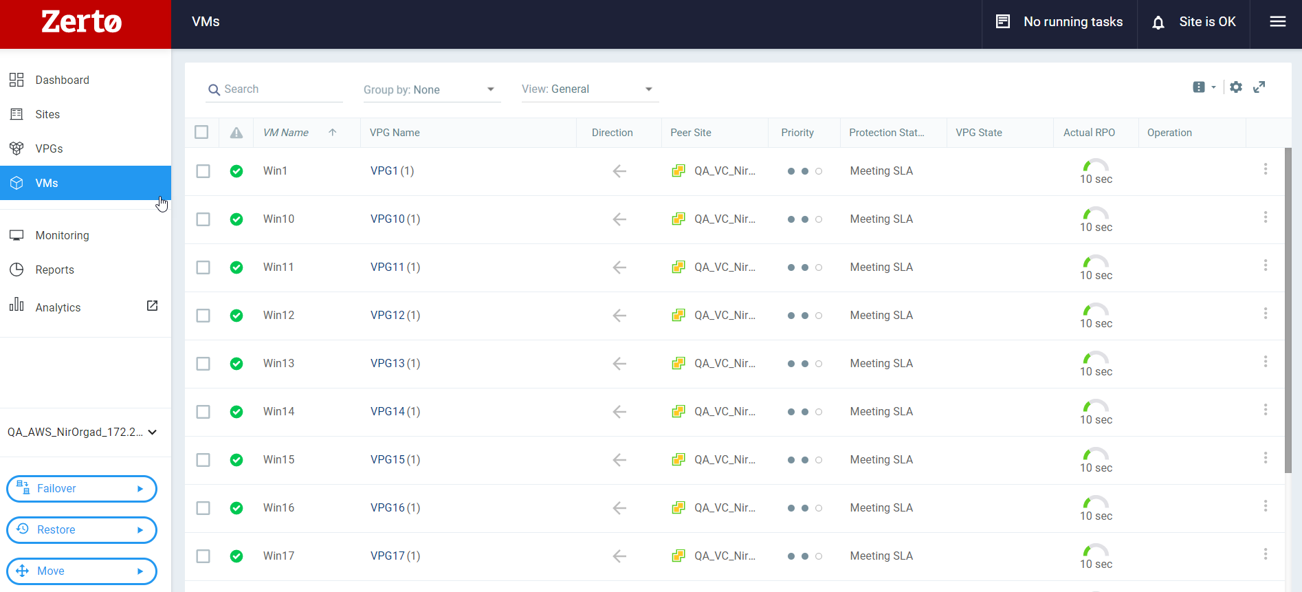This tab lists all the protected virtual machines from both the local and remote sites and provides summary details of each virtual machine.