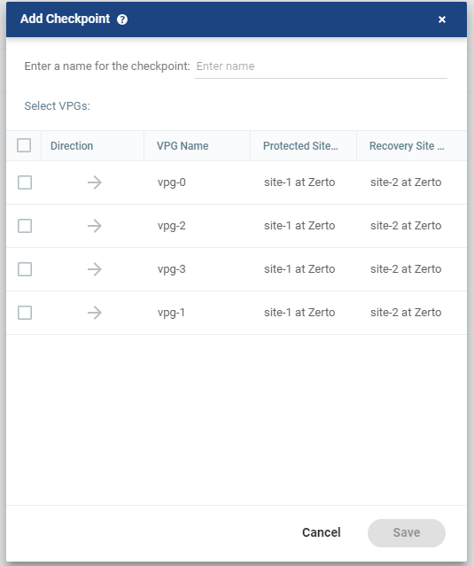 The list of VPGs is displayed. You can select more VPGs to add the same checkpoint.