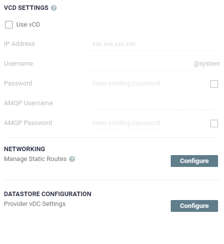 Provider vDC Settings: Click Configure to define provider vDC settings and their datastore configuration. See Configure Provider vDCs Dialog.
