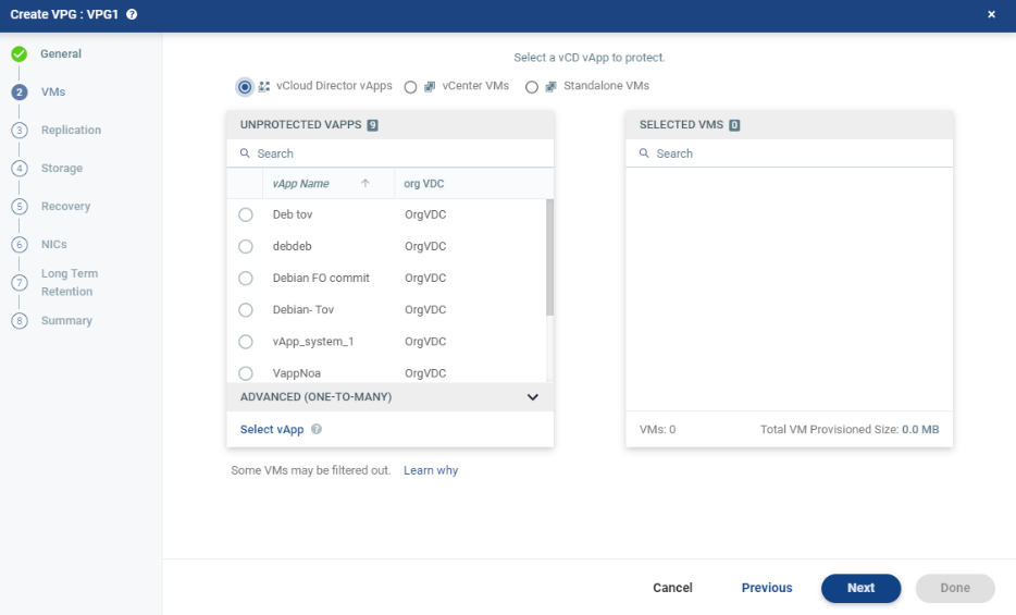 | 5. | To view protected vApps, in the Advanced (One-to-Many) section, click Select vApp. |