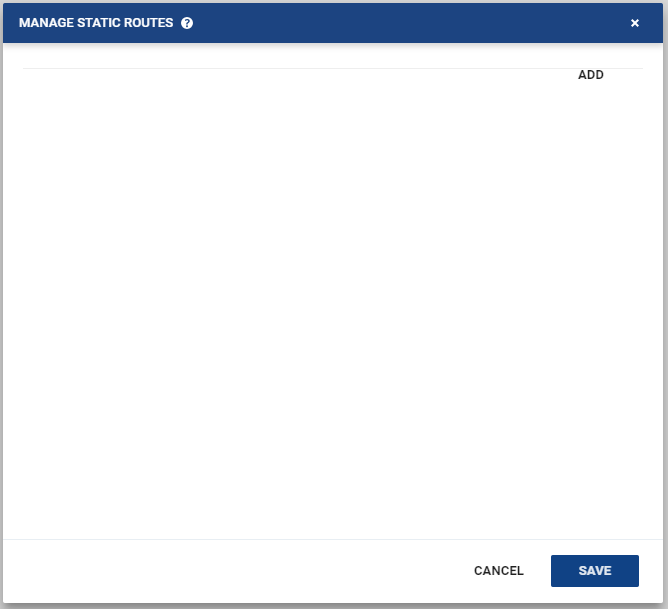 ADD: Click this field to add an entity and to define the static route it will use. Once you click ADD, the dialog changes: |