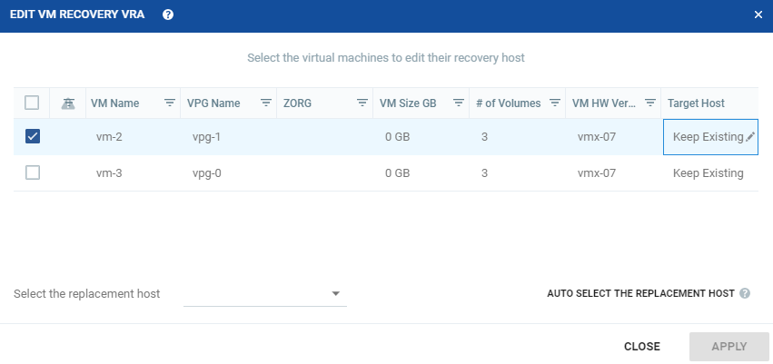 | • | Select the replacement host: The name of the host to move the recovery virtual machines. |