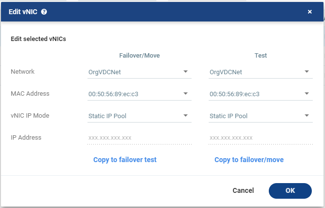 Copy to failover/move: Copies the settings in the Test column to the Failover/Move column.