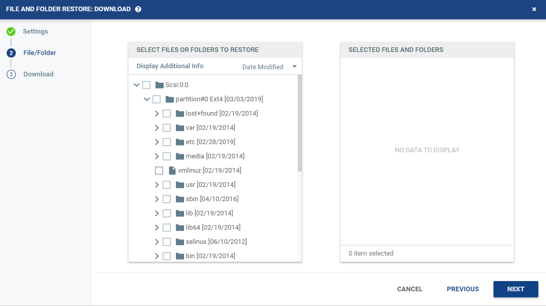 In this procedure you select the files and folders. The files are downloaded to the machine where you run the Zerto User Interface. Make sure that this machine has enough space for the recovered files.