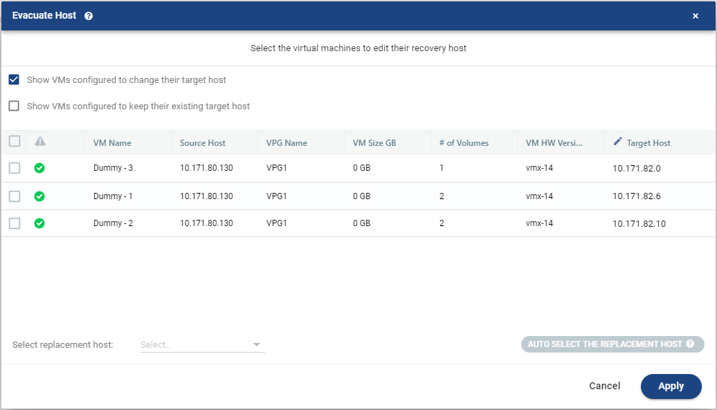From the bottom right of the window, click Auto Select the Replacement Host to automatically select the most suitable host for that virtual machine. Auto-selection is based on a load-balancing algorithm. |