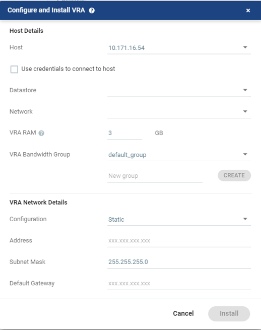 Host: The host on which the VRA is installed. The drop-down displays the hosts that do not have a VRA installed, with the selected host displayed by default. |