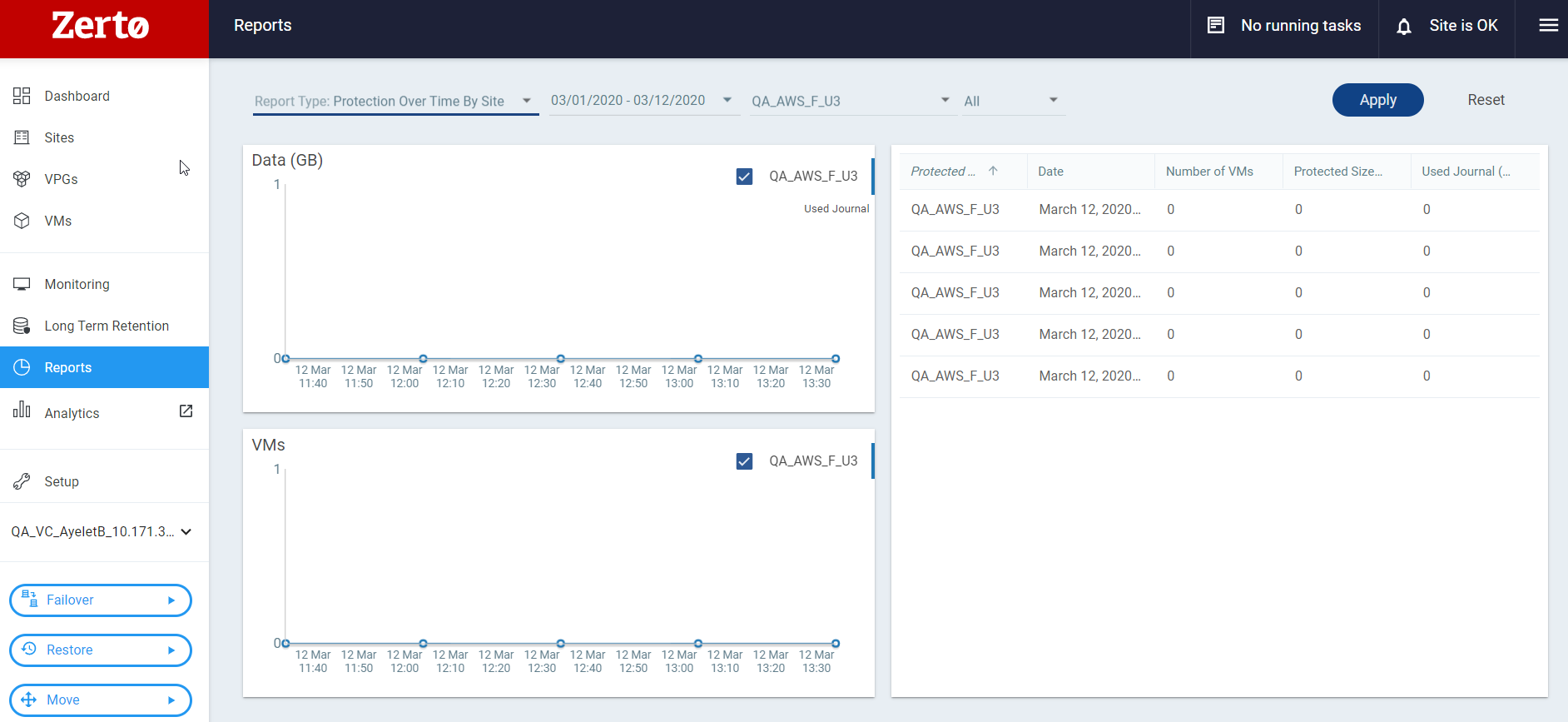 Information about the virtual machines and the amount of data on the recovery site can be displayed in the Protection Over Time by Site report under the REPORTS tab. When the report is displayed for the first time, information is shown per 30 minute intervals.