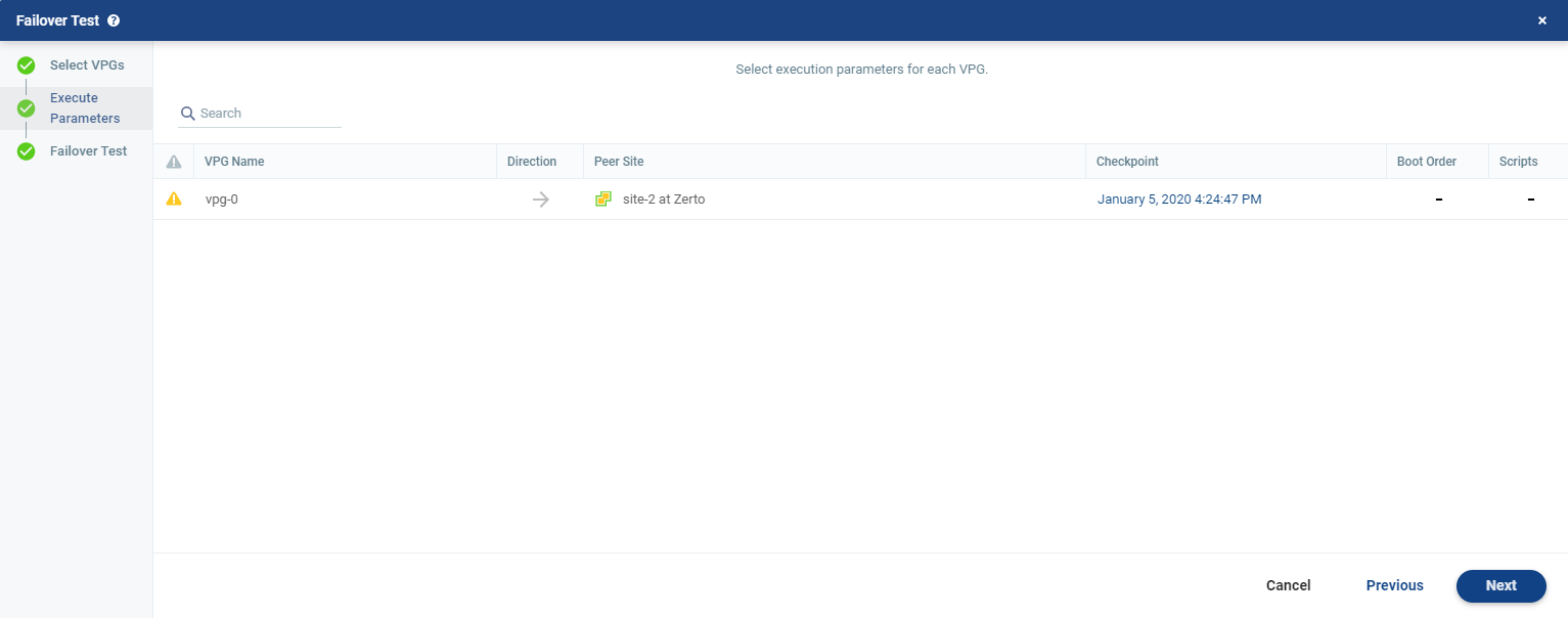 You can initiate the failover test from either the protected site or recovery site. You cannot select specific VMs in a VPG for failover test if the protected site is down. |