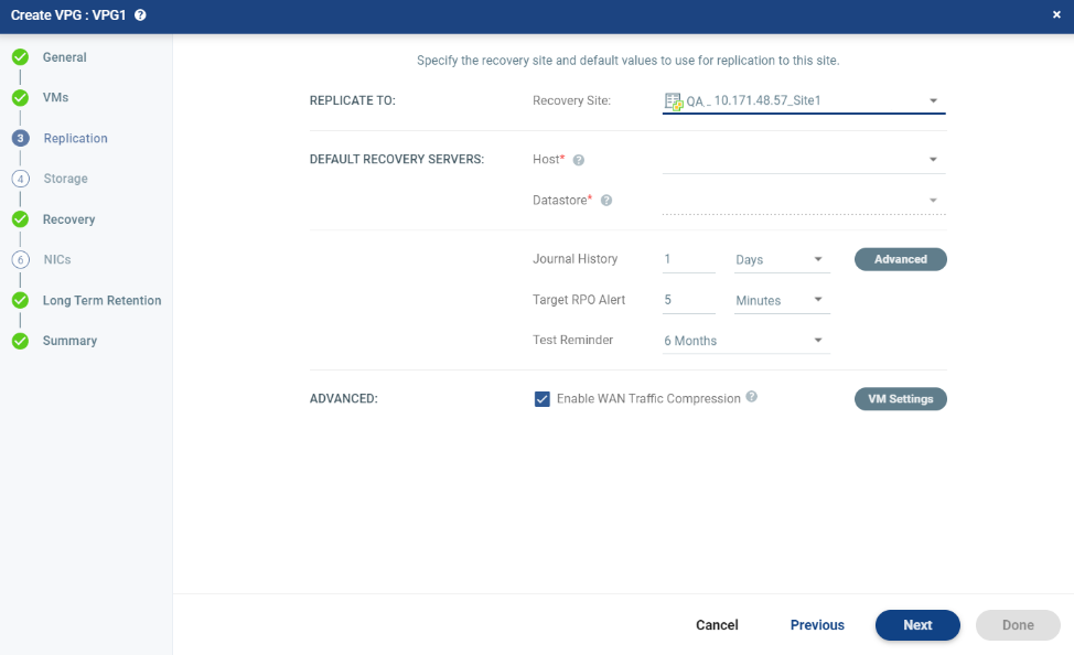 Enable WAN Traffic Compression: Whether or not data is compressed before being transferred to the recovery site. Compressing the data is more efficient, but results in a small performance degradation. |