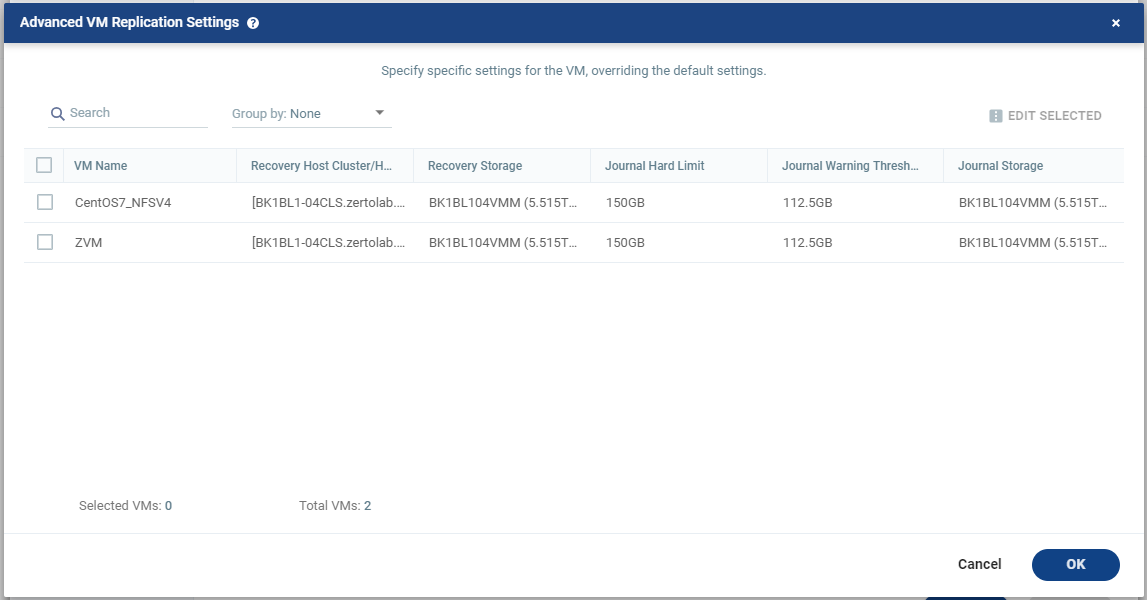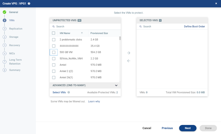 | Note: | Virtual machines can be protected in a maximum of three VPGs. These VPGs cannot be recovered to the same site. Virtual machines protected in the maximum number of VPGs are not displayed in the Select VMs dialog. |