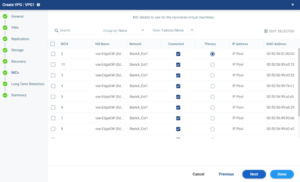 The NICs step is displayed. In this step, you can specify the NIC details to use for the recovered virtual machines after a failover, a test failover, or migration.