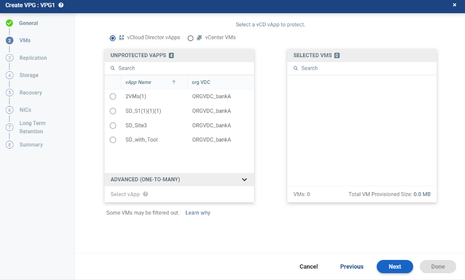 Only vCD vApps that are unprotected are displayed in the list. A VPG can include: |