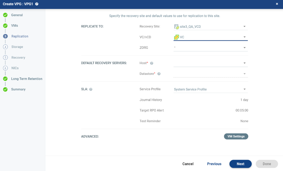 In the Replicate To area, specify VC as the recovery site and default values to use for the replication to this site. |