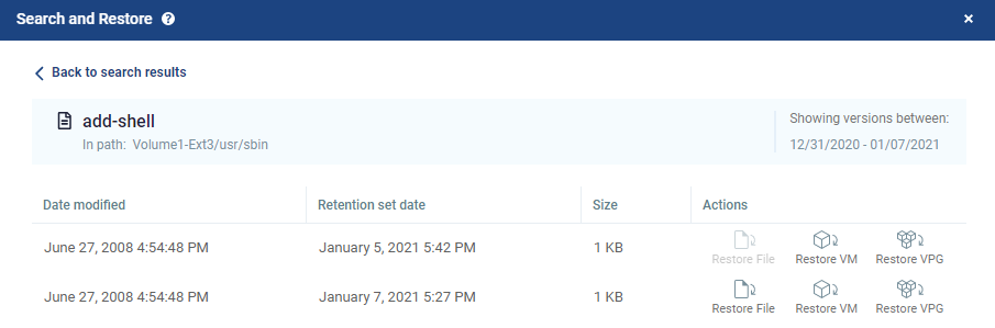 | 1. | From the window which shows revisions of the selected file or folder, choose a restore point and click the Restore VM or Restore VPG icon. |