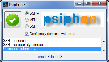 Furthermore, in SSH and SSH+ modes, Psiphon 3 offers a split tunnel option where international traffic is tunneled through the proxy and domestic traffic is not. Check the “Don’t proxy...” option to enable split tunneling. When this option is on, unproxied domains are reported in the message area.