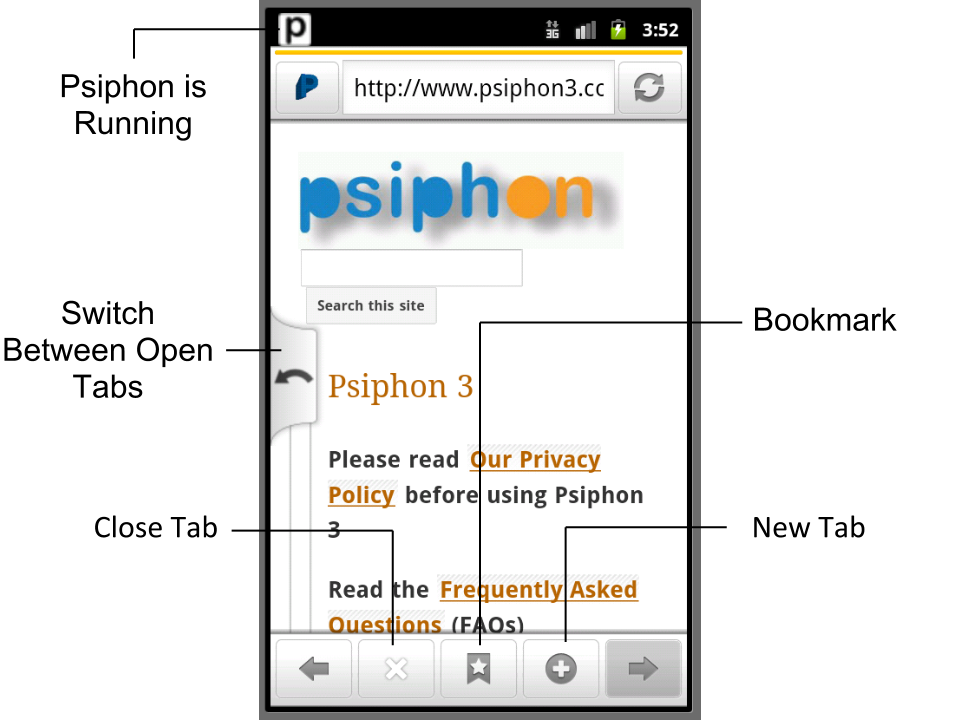 Once the app has connected to the network, it will launch the built-in Psiphon browser. Psiphon 3 for Android does not automatically tunnel the traffic for the default Android browser or other apps. By default, only the Psiphon browser is tunneled through the Psiphon 3 network.