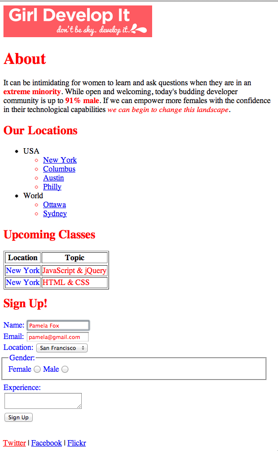 Starting with the solution from the HTML 2 exercise, add CSS rules to the webpage so that it looks like the screenshot below. All the CSS rules should have "color: red;" or "color:blue;" as the property-value pair, and just use different selector types to style the different parts of the page.
