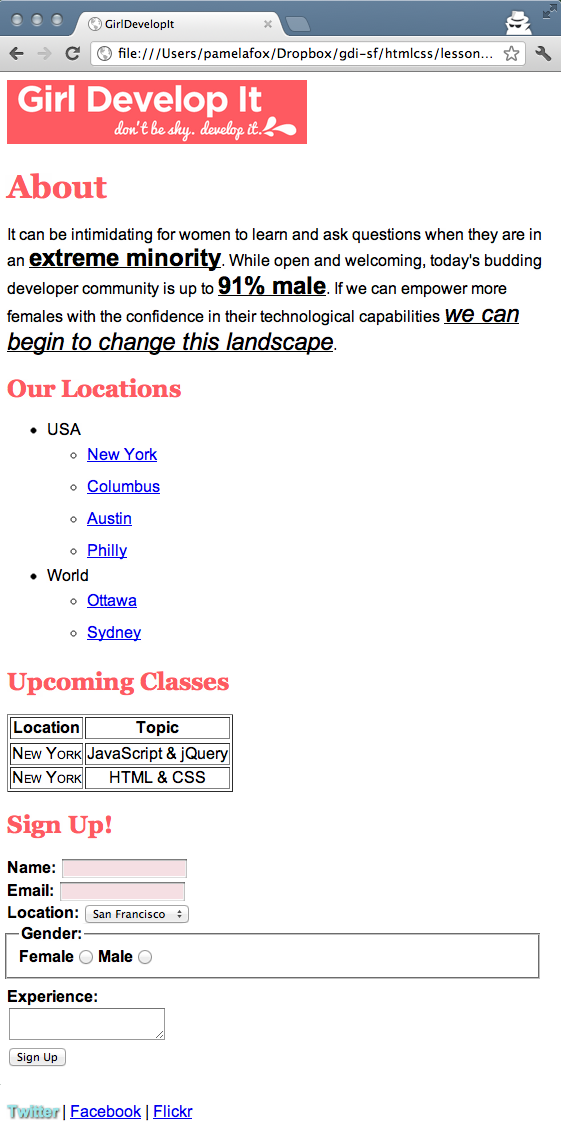 Starting with the solution from the selectors exercise, add property value pairs to the CSS rules so that the page looks like the screenshot below.