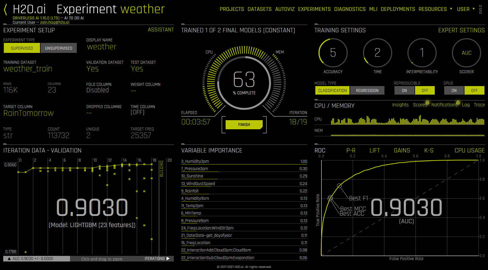 For classification problems, the lower right section includes a toggle between an ROC curve, Precision-Recall graph, Lift chart, Gains chart, and GPU Usage information (if GPUs are available). For regression problems, the lower right section includes a toggle between a Residuals chart, an Actual vs. Predicted chart, and GPU Usage information (if GPUs are available). (Refer to the Experiment Graphs section for more information.) Upon completion, an Experiment Summary section will populate in the lower right section.