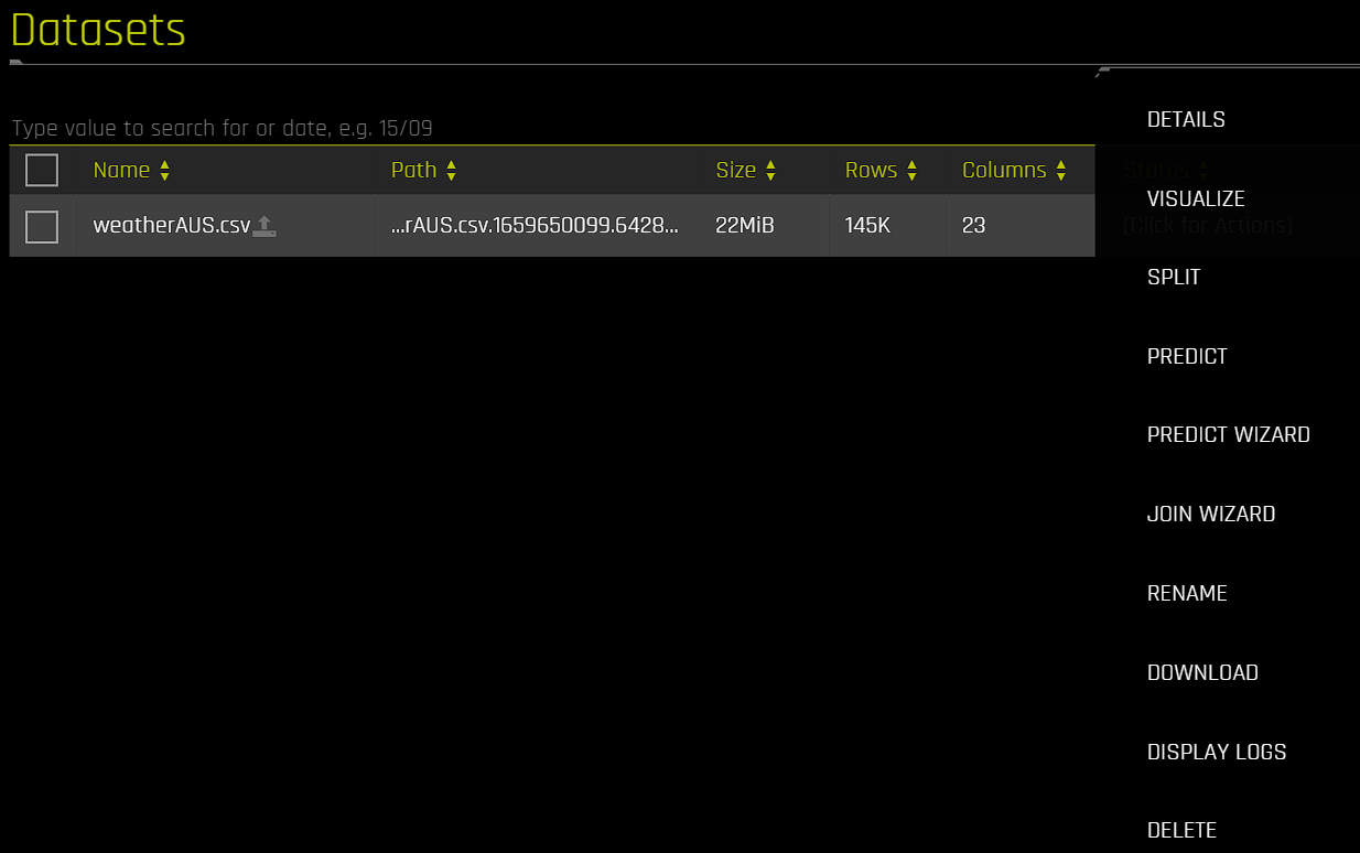 The following is a list of options that are available for every dataset on the Datasets page. To view these options, click Click for Actions next to any dataset listed on the Datasets page.