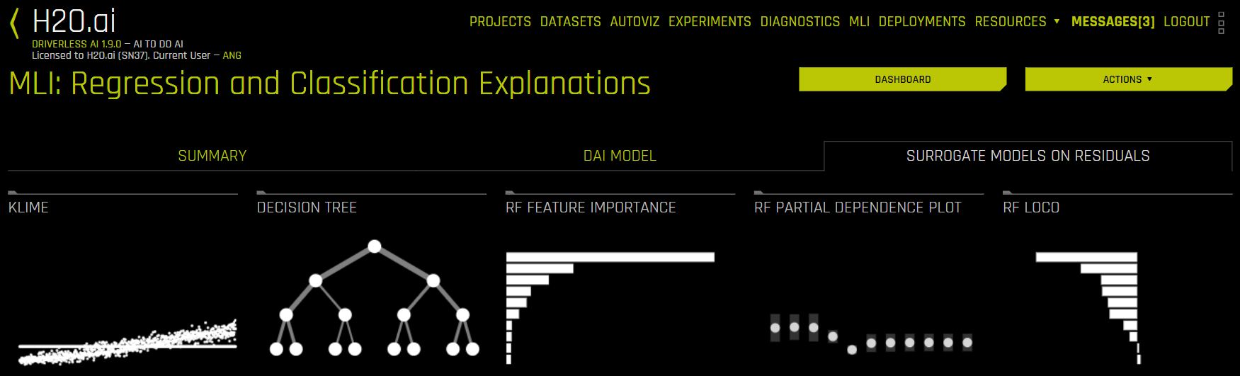The Surrogate Models Dashboard button reveals a dashboard with an overview of the interpretations built using surrogate models. The Actions button on the MLI page can be used to download reason codes, scoring pipelines for productionization, and MLI logs.